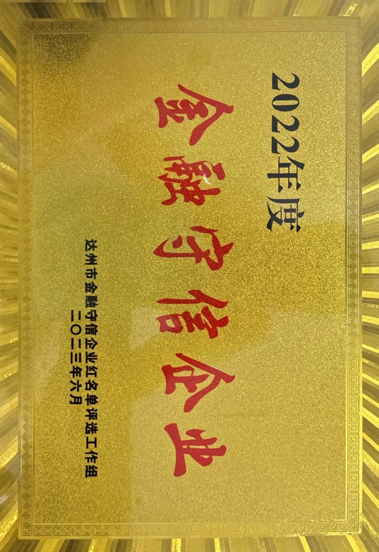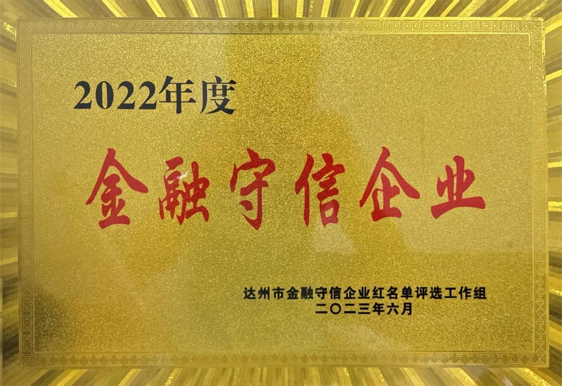 2023年6月經(jīng)我市16家行業(yè)主管部門嚴(yán)格審核并公示無異議,評選出了2022年“金融守信企業(yè)”紅名單,我司以良好的信用管理水平獲此殊榮。2023年7月4日農(nóng)業(yè)發(fā)展銀行達(dá)州分行正式將牌匾授予我司。