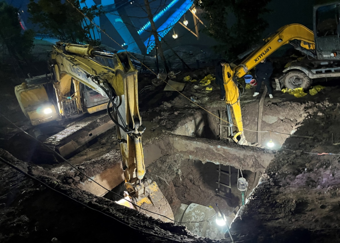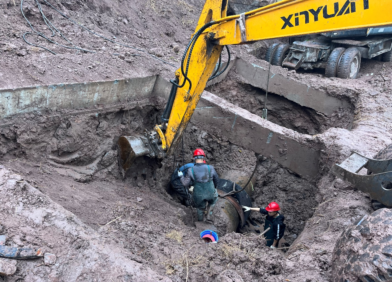 險情發(fā)生后,水務(wù)集團黨委高度重視,黨委書記、董事長盧輝帶隊奔赴搶險現(xiàn)場指揮調(diào)度,要求惠泉公司立即組織搶修,盡快恢復(fù)管網(wǎng)運行,盡最大努力減少污水外溢,集團安全環(huán)保部、規(guī)劃建設(shè)部、惠潤達公司到場指導(dǎo)協(xié)助。惠泉公司領(lǐng)導(dǎo)班子立即召開緊急現(xiàn)場會,連夜組織調(diào)度搶險人員和設(shè)備,出動搶險人員100余人次,挖掘機、吊車、多功能搶險車等工程機械10余臺,合理調(diào)配人手,組建臨時班組,采取人機輪班,就地休息的方式,在確保安全的情況下,迅速開展搶險工作。