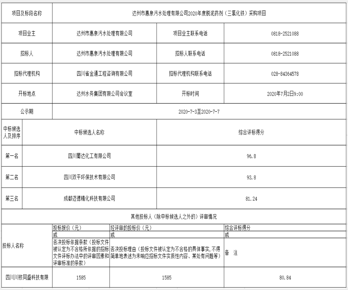 上一篇:達州市惠泉污水處理有限公司2020年度單過硫酸氫鉀復合粉采購項目中標候選人公示